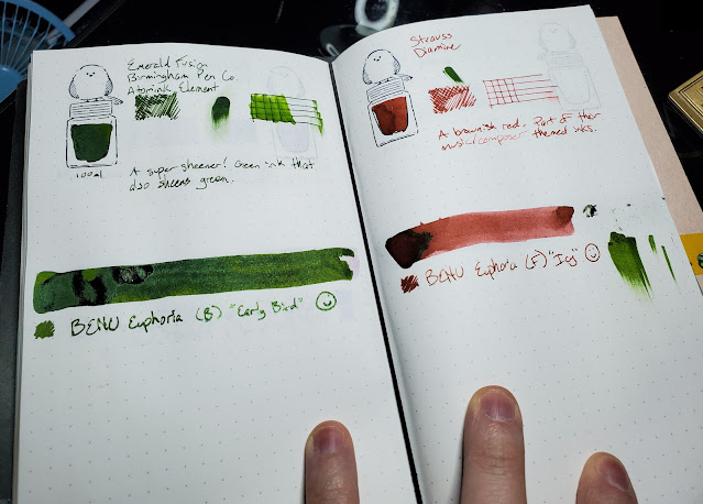 I know a lot of folks match their pens and inks together, and I may do that now and then, but I want to avoid feeling like I need to do that. I want to use inks in pens that play nicely together, regardless of the color matching. (If they do match, that's a plus though!)