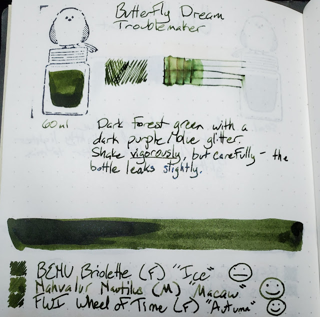 🙁 - The frown. It's exactly what you think it is. Hard starts, poor flow, shimmer/sheen just don't work at all, and other problems. Maybe this ink is a "dry" ink, and this pen only really works with "wet" inks. Whatever the case, this pairing should be avoided in the future!